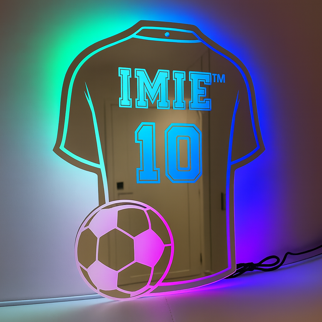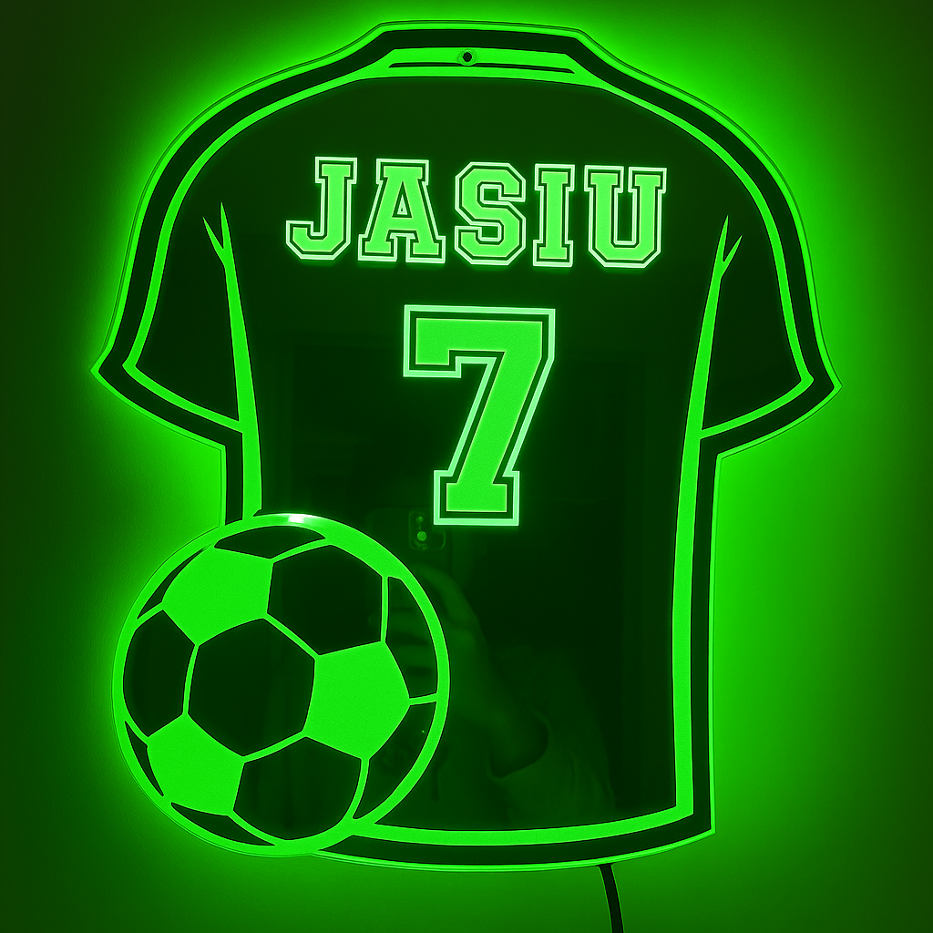 Podaruj coś, co naprawdę robi wrażenie! Personalizowane lustro LED w kształcie koszulki piłkarskiej to idealny upominek dla każdego młodego zawodnika i fana futbolu. Wybierz imię, numer i stwórz dekorację, która rozświetli pokój i serce małego sportowca.